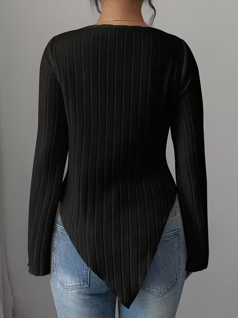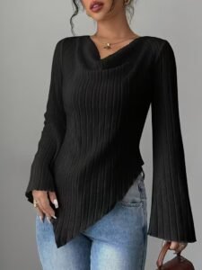 Con un favorecedor escote en V y mangas acampanadas, combinado con un dobladillo asimétrico, este diseño no solo estiliza el cuello y los hombros, sino que también disimula la grasa no deseada en brazos o cintura, transmitiendo una sensación delicada pero sutilmente sexy, capturando sin esfuerzo un estilo sofisticado y juvenil.
