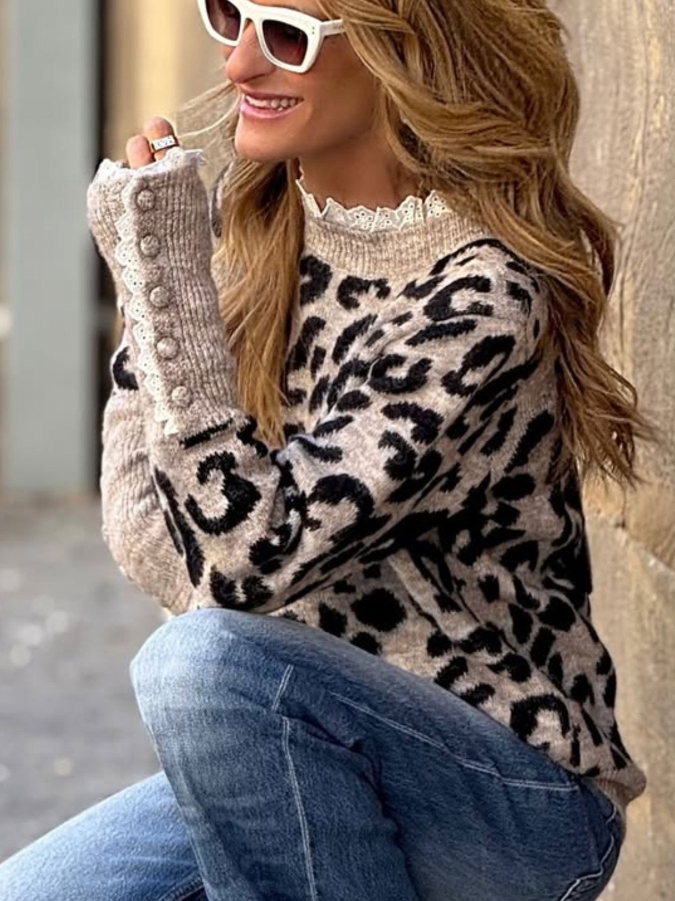 Este suéter combina con ingenio el atemporal estampado de leopardo con detalles de encaje en el escote, creando un look delicado y a la vez original. Los botones decorativos en los puños le dan el toque final, añadiendo más detalle al estilo general, lo que lo hace adecuado tanto para el día a día como para ocasiones más sofisticadas.