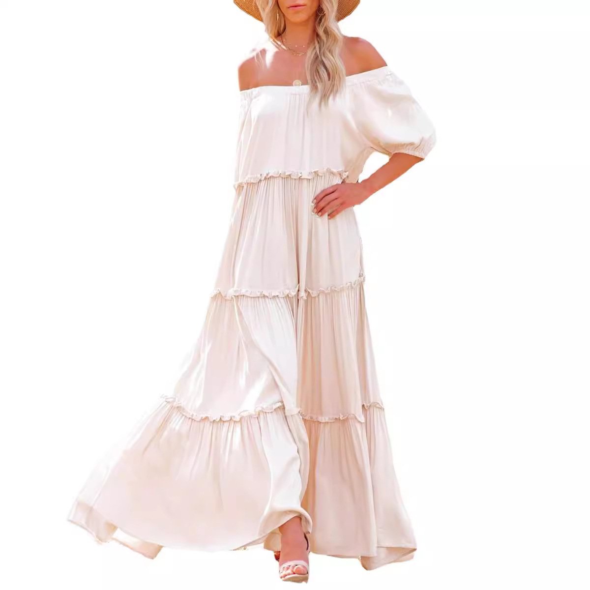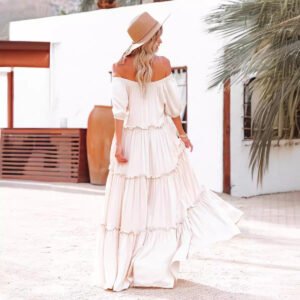 Ivanze ubwiza bw’Abafaransa n’ubwiza bwa bohemian, iyi kanzu ifite imiterere idasanzwe hamwe n’amajipo meza kandi meza akora ishusho idasanzwe. Imiterere y’amabara y’umweru asanzwe ni nziza ku myambarire itandukanye yo mu mpeshyi, bigatuma byoroha kugaragara.
