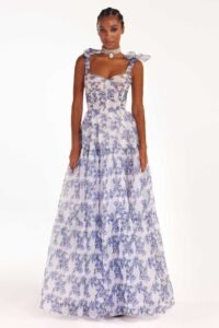 Confeccionado en organza de alta calidad y malla, es a la vez elegante y fluido, con una falda amplia que crea una silueta de princesa; el diseño sin tirantes y con los hombros descubiertos favorece el cuello y los hombros, mientras que la silueta en línea A de talle alto estiliza y favorece a todo tipo de cuerpo.